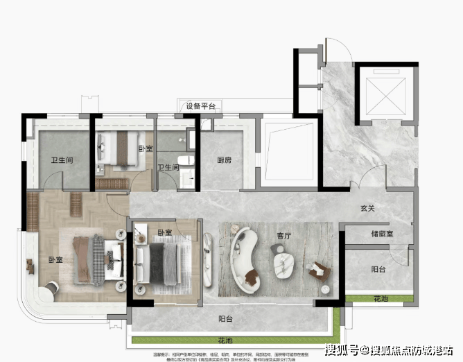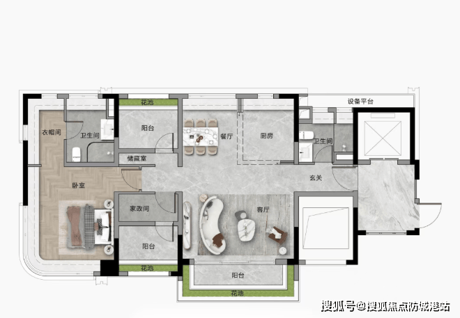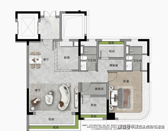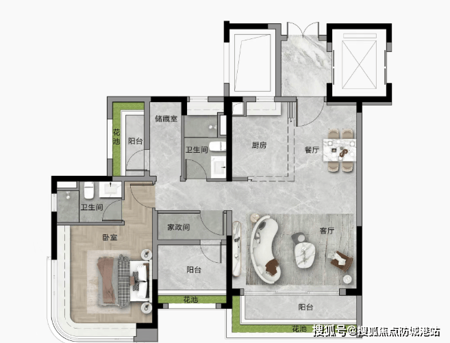 108/110㎡三房:带入户花园,空间使用率远超市场水平,主卧270°转角飘窗。