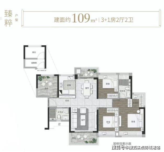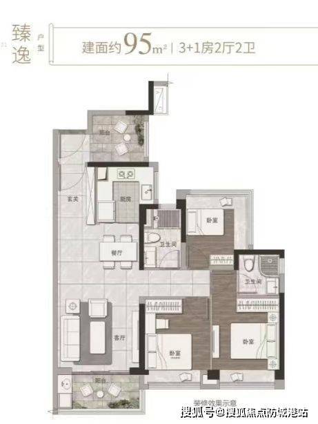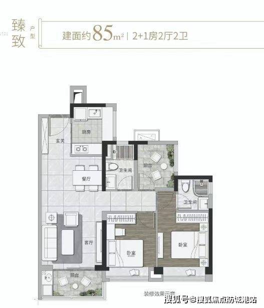 对于预算有限但又追求实用的家庭来说,85㎡的 2 + 1 实用户型是个不错的选择。高得房率使得同等面积下比其他户型多一卫,满足家庭日常使用需求,避免了早晨洗漱的拥挤。