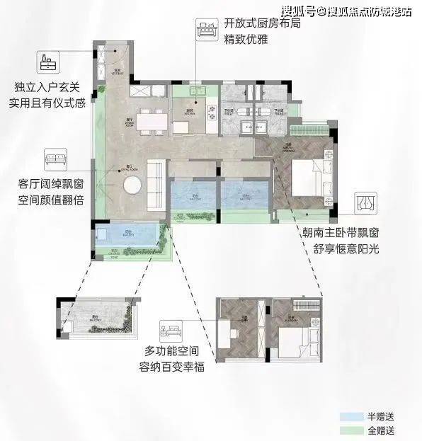 建面约84㎡三房,升级为南向四面宽!客厅、阳台、两大灵动空间、主卧,通通朝南,做出了100平的感觉。