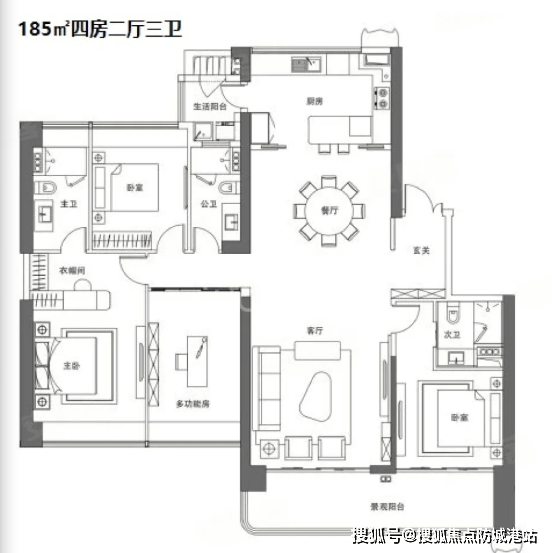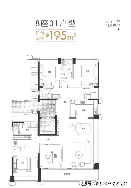 项目规划8栋住宅,共952户,采用纯板式、全南向布局,楼距开阔,确保每户南北通透、采光充足。主力户型以改善型大平层为主,空间设计强调尺度感与功能性:270°环幕转角宽厅、约3.15-3.3米层高、专梯专户或三梯两户配置,极大提升居住尊崇感与私密性。