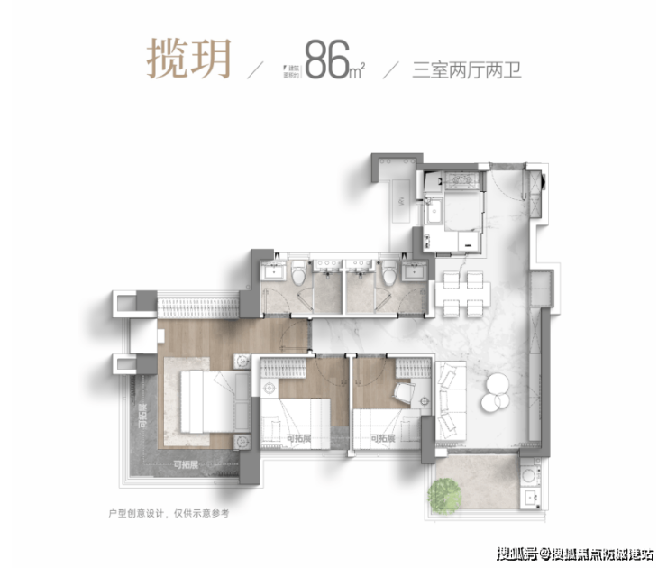 88㎡三房两卫:横厅设计,南北对流,6.2米超级阳台连通客厅与次卧;