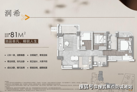 约81㎡ · 大3房2卫:全盘仅60套,可成长次卧设计,赋新空间更多可能;主卧套房设计,重视主人居住体验。