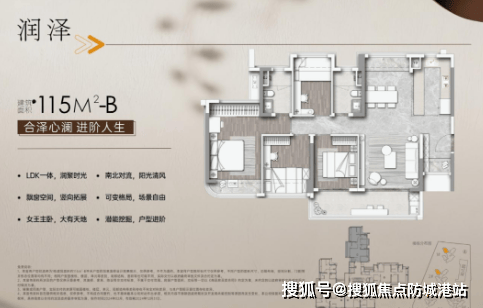 约115㎡ · 南北对流四房:可根据家庭所需灵动变化为三居室,合理利用每寸空间;近15米南向面宽,5开间朝南,享受极致的清风与暖阳。