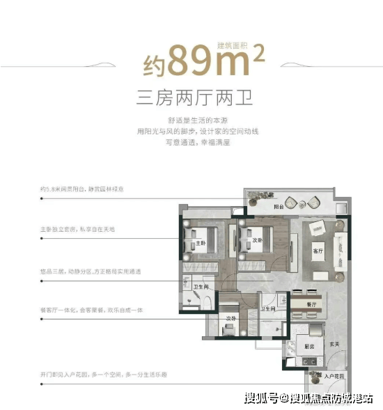 户型设计特点:主力户型为89-168平方米三至五房,设计注重空间实用性。例如,89平方米三房带5.8米阔景阳台,128平方米四房南北对流,提供了宽敞明亮的居住体验。叠拼产品(159-163平方米)则享有私密庭院和景观资源,满足不同家庭的需求。