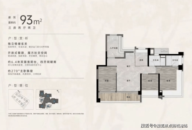 宽境南向格局,面宽约 13.6 米,大横厅采光面,主卧奢阔套房,飘窗拓展空间大,双阳台对流通风,厨卫全明,实用率约 112%,品质改善户型,社区内稀缺宽厅产品,居家舒适度拉满。