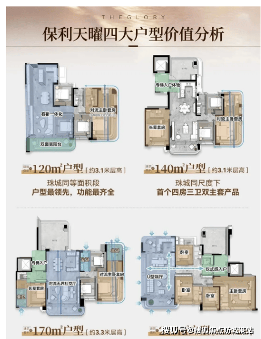 保利天曜作为天河唯二的超新规地块项目,打造建面约 90-220㎡新规全景奢宅,分为南北两大地块开发,南地块为纯板楼设计,主力户型为 120-210㎡四房,北地块为塔楼设计,涵盖 90㎡三房等户型,整体户型规划遵循 “高使用率、优采光通风、强景观视野” 的原则,阳台面积占比可达 25%,同时引入保利 “六恒系统”(恒温、恒湿、恒静、恒洁、恒氧、恒净),以科技赋能居住体验,不同户型均有独特的设计亮点,满足刚需、改善、高端置业等不同购房者的需求。项目南地块楼间距最宽处超过 70 米,最窄处也有 50 米出头,正南北全 T2 板楼设计,实现专梯入户,通风强、互视少,延伸南向大面宽,规划更多南向开间;北地块为全南向舒展 T3/4 楼型,楼栋 / 梯腿间法线相错,降低互视影响,户户皆为南向单边位,尽可能延长单体面宽,提升通风采光能力,所有户型均能享受良好的景观视野与居住体验。以下为项目在售主力户型的详细设计描述: