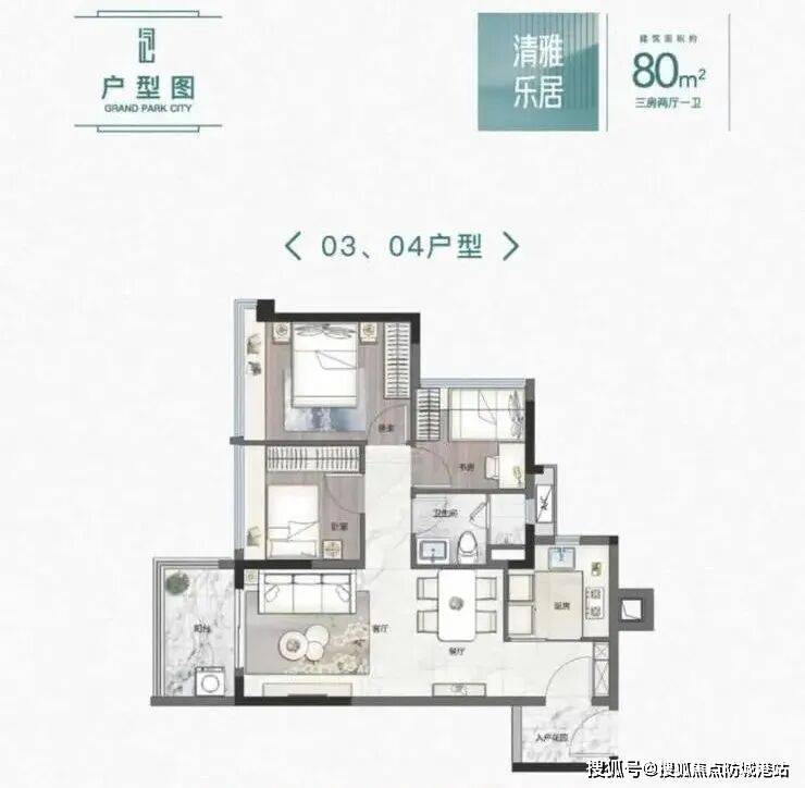 主力户型集中在89㎡三房和105㎡四房,得房率在同区域里算不错。以89㎡为例,主卧带飘窗,次卧和书房灵活可变,厨房U型布局操作动线合理,阳台连通客厅后采光很足。所有户型都标配油烟机、煤气灶、消毒碗柜和卫浴三件套,交房即具备基本烹饪和洗漱条件,对预算有限的年轻人来说,能省下一笔不小的软装开支。
