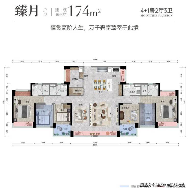 174㎡4+1房2厅3卫:七开间朝南,通风采光极佳,约6.7米超长客厅开间,景观视野极佳,隐藏式生活阳台,私密性强,双飘窗主卧,带独立衣帽间,双套房设计,居住体验感超佳。