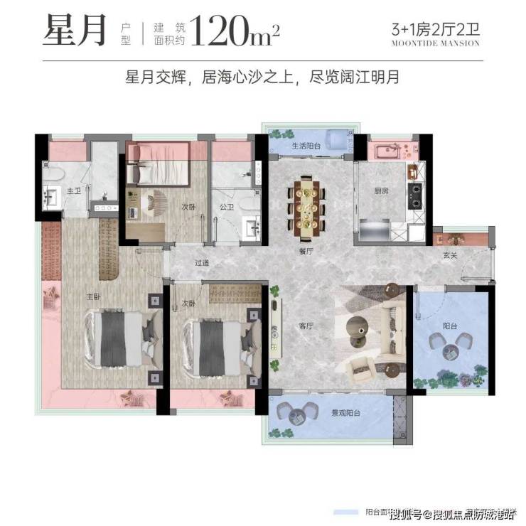 120㎡3+1房2厅2卫:南北对流双阳台,通风采光极佳,约4.4m开间大客厅,奢享大家风范,主卧配置270°IMAX江景飘窗。