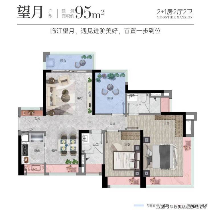 95㎡2+1房2厅2卫:南北对流,通风采光极佳,大面积赠送空间,超高使用率,主卧配置270°IMAX江景飘窗。