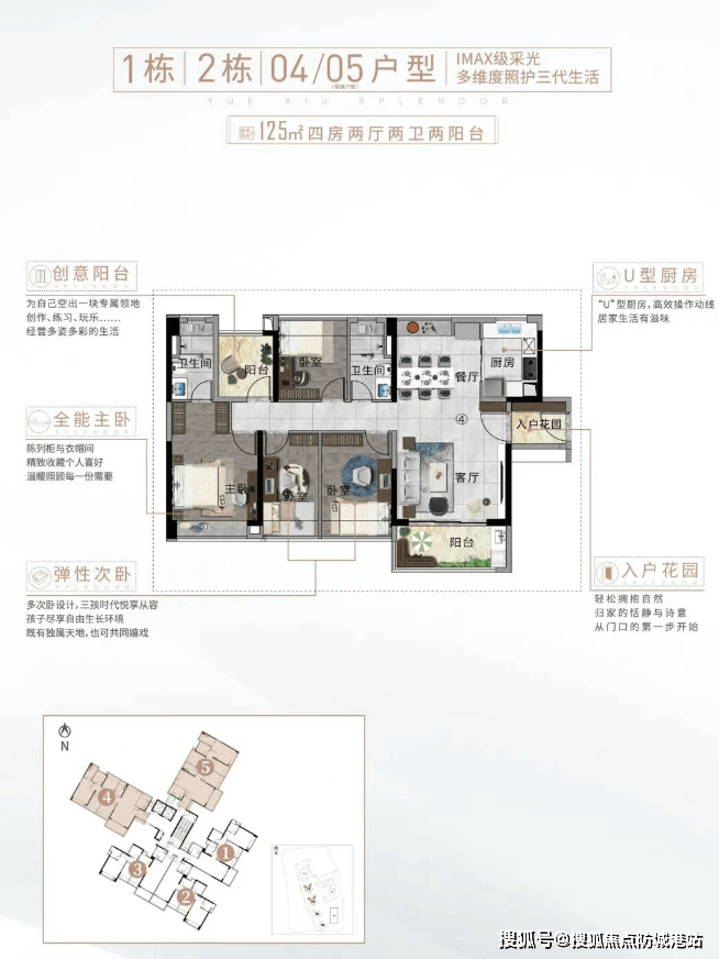 作为现楼项目,越秀星耀TOD住宅部分仅550套,稀缺性突出。主力户型为99㎡三房两卫与125㎡四房两卫,全系户户朝南,采用经典竖厅布局,动静分区合理。99㎡户型配备双阳台与灵动空间,可灵活改造为儿童房、书房或健身区;125㎡则增设入户花园、独立衣帽间及创意阳台,满足多孩家庭进阶需求。小区采用4栋点状式布局,确保每户拥有开阔观景视野,无一户朝北,居住舒适度高。