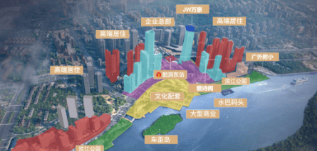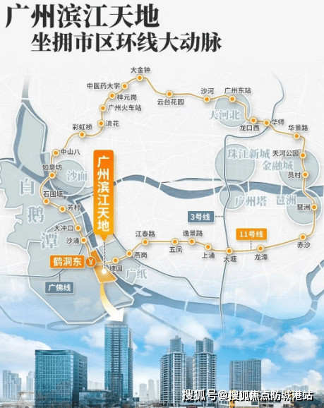 广州滨江天地紧邻地铁11号线鹤洞东站,直线距离不到200米,未来还将接驳佛山地铁11号线。此外,项目通过广州首条环线11号线可快速连接珠江新城等重要商圈,同时设有水上巴士,方便居民通达珠江两岸。这种“TOD”模式(即以公共交通为导向的发展模式)不仅提升了出行便捷性,也进一步增强了项目的吸引力。