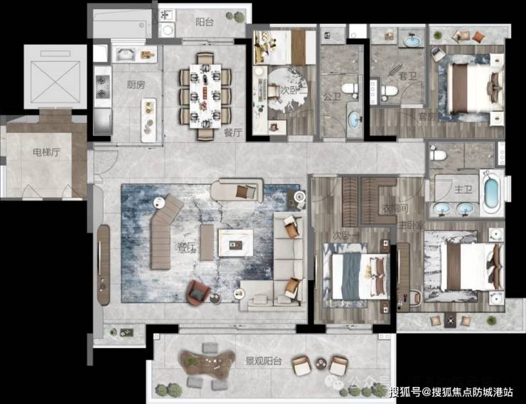 在建筑形态上,项目采用了罕见的板式建筑结构,实现了南北对流,确保了室内通风与采光的极致效果。户型设计开创了大面宽、大开间、双阳台的先河,特别是针对约186㎡的环幕大宅,设计了全城罕见的约8.3米南向观景阳台,配合270°一线广角山景,将自然景观毫无保留地引入室内。这种设计不仅刷新了区域的豪宅交付标准,更赋予了生活无限的想象空间。私家电梯入户的设计,则为业主提供了尊贵的归家仪式感,实现了真正的“门当户对”。