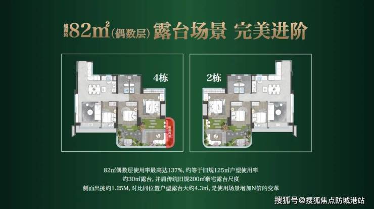 第四代住宅设计:通过错层阳台和空中花园设计,实际使用面积远超传统住宅,82㎡户型实得112㎡,110㎡户型实得158㎡,125㎡户型实得176㎡。