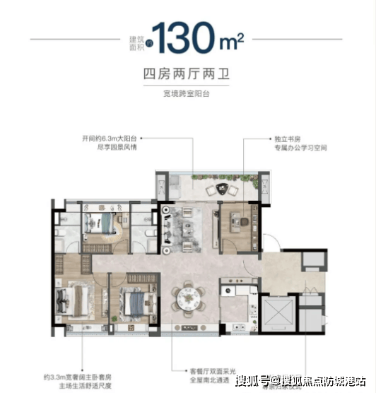 建面约130㎡四房两厅两卫户型,拥有阔绰电梯前厅,打造尊崇归家仪式;客餐厅双面采光,全屋南北通透,空间明亮开阔;开间约6.3米大阳台,能尽享园景风情;超奢阔主卧套房,配备独立衣帽间和卫浴,感受生活舒适尺度;独立书房设计,为业主提供专属的办公学习空间。