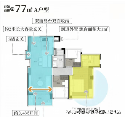 建面77平A户型:东南朝向,客厅开间3.4米,总价约190-210万。