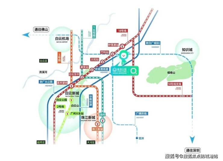 地铁:项目距离地铁14号线钟落潭站一期仅900米,二期则缩短至500米。通过地铁5站即可到达嘉禾望岗,换乘2号线或3号线可直达白云新城及广州其他重要区域。