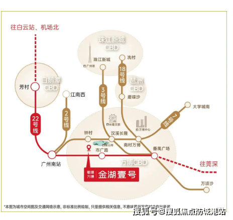 达番禺广场、2 站至万博中心,3 站抵琶洲 CBD、4 站达珠江新城。此外,五横五纵立体交通网络畅达广州各核心城区,项目旁规划配建公交首末站,门前约 200 米的敏捷集团公交站有 8 条公交线路,出行方式多样且便捷。