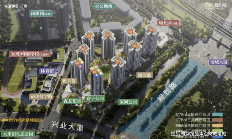 万科·檐屿城周边配套齐全,教育资源逐步完善。项目规划36班规模的九年制学校,同时引入国际双语学校博萃德,形成高起点的教育环境,这种国际化与本土结合的教育体系在广州南站板块尚属少见,提升区域的教育竞争力。商业配套方面,项目打造约一千平方米的檐下烟火商业街,保留岭南传统骑楼与柱廊特色,融合现代潮玩元素,为居民提供丰富多样的购物和休闲体验。紧邻汉溪大道的18座地标配套逐渐兑现,包括全国最大的足球场、万博长隆文旅核心等,形成集文体、旅游、商业于一体的多元生活圈。医疗方面,附近富力UCLA医院和番禺区第五人民医院为居民提供优质医疗保障。项目还自建滨河公园,整合自然水岸资源,打造滨水休闲街区,提升生活品质与生态价值。