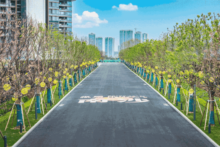 一条350米的景观大道从城市道路蜿蜒而入,两侧全冠移植66株大冠幅香樟——没错,就是鹏瑞1号同款。