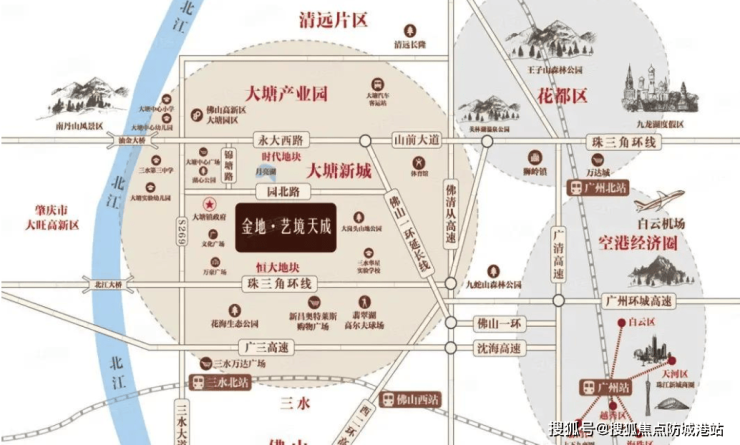 佛山金地艺境天成地理位置优越,位于三水大塘新城中心,东接广州白云花都,西连肇庆高新区,北向清远,南至佛山中心,恰好处于广佛肇清四城交汇点。周边已经建立起了完善的“三横四纵”高速网络,使得从项目出发到重要交通枢纽如高铁站(广州北站+三水南站)、机场(白云机场+高明机场)、轻轨站(广州北站+三水北站)以及港口(大塘港区)均能在半小时车程内到达。未来随着交通基础设施的进一步优化升级,这里将成为连接各大城市的便捷通道,极大地提升了区域内的通达性和便利性。