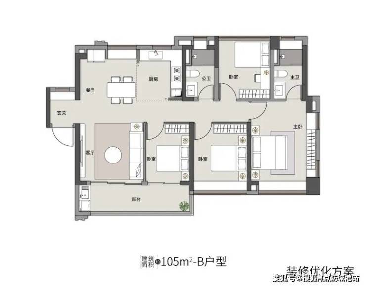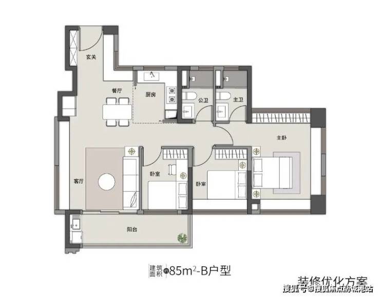 85㎡三房:四开间朝南,主卧三面采光,L型飘窗可改造成衣柜,空间利用率极高。