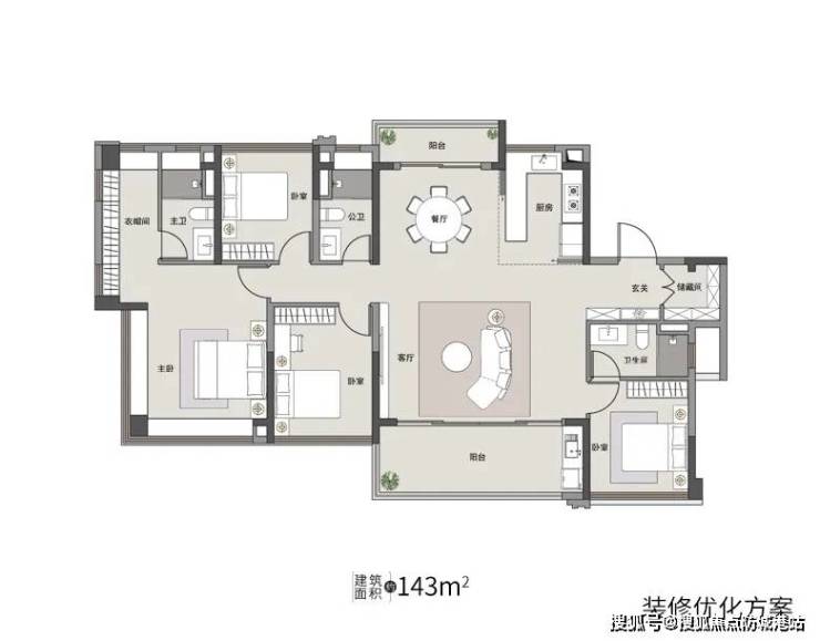 143㎡四房三卫:双主卧套房+南北双阳台,LDK一体化设计,空间尺度媲美大平层。
