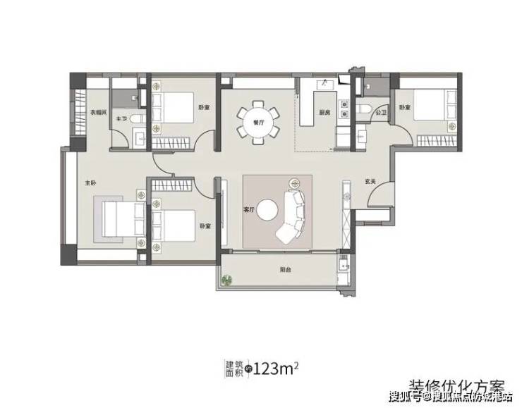 123㎡四房:大方厅+开放式厨房,三面采光+飘窗设计,主卧配备豪华衣帽间,适配多代家庭。