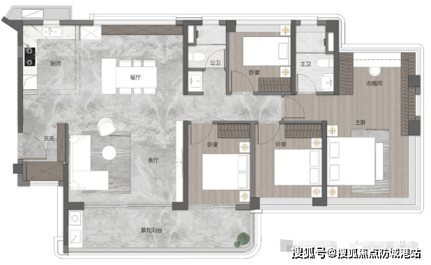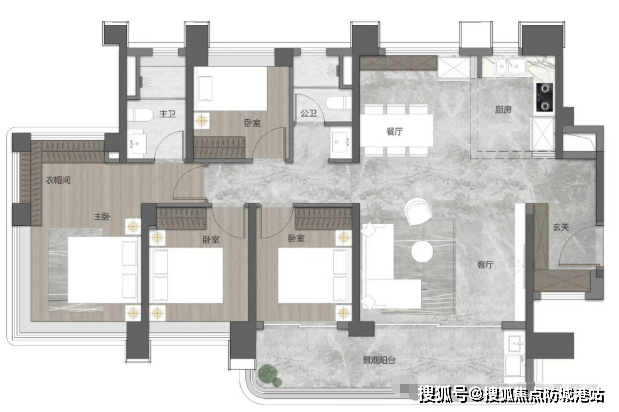 195㎡江景大平层:LDK客餐厅面积超70㎡,两侧观江面总长16米,阳台长度8米,双主卧设计,主卧带独立衣帽间+观江浴缸。