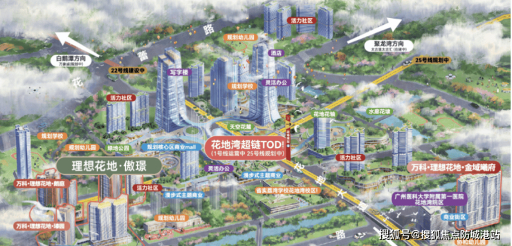 项目直线距离地铁1号线花地湾站约300米,交通便捷,未来通过天空花麓系统可实现地铁直达,免受风雨影响。周边通向珠城及周边区域的道路网络完善,形成高效的通勤环境。项目所在片区交通便捷,结合规划中的25号线,形成双核TOD模式,兼顾城市通达性与高端居住体验。