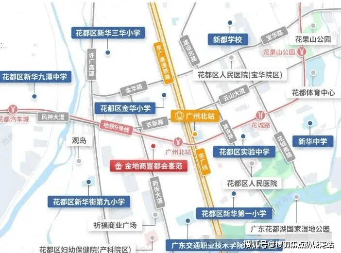 【金地商置都会峯范】位于花都中轴CBD核心区,紧邻地铁9号线花都广场站(直线距离约300米),周边华南快速、广清高速等主干道环绕,20分钟直达白云新城,30分钟通达珠江新城(实测车程)。