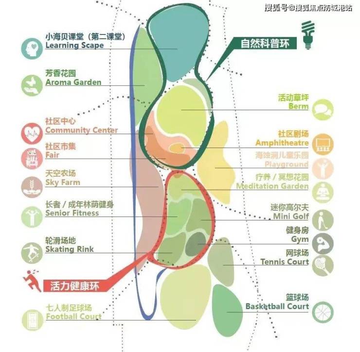 这个大型市政公园还有非常丰富的功能区,以社区中心“海贝中心”为核,北侧靠近学校布置自然科普环,南侧为活力健康环。自然科普环串起自然课堂、沙丘植物园、海浪亲子农场和海蚀洞儿童乐园。活力健康环以海贝活力馆为中心,分别布置球场、全龄室外健身场地和轮滑场地等等。