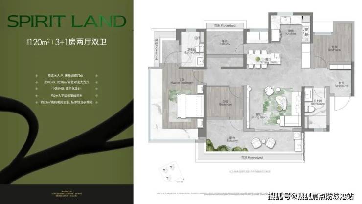 建面约120平方米四房两厅两卫:海珠唯一1000万内南北通透大四房,双玄关入户。LDKG+X,约28平方米南北对流大方厅,豪宅同款中西分厨。