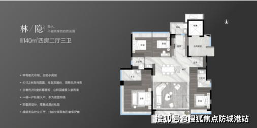 窗地比高达38%:全屋窗地比达到38%,远超广州常见的0.25住宅窗地比,让业主站在室内的不同位置都能尽揽美景。主卧还设置了270°大飘窗,拓展室内空间感。