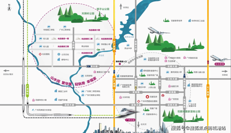 交通网络发达:毗邻广清城轨乐同站,一站即可到达广州北站;地铁9号线花都广场站步行可达;未来还将有18号线、24号线等多条线路提升出行便利性。此外,通过白云机场T4航站楼及APM线,6分钟可直达机场。