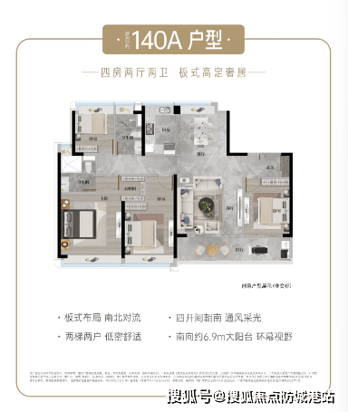项目主推建面约 140-253㎡四至五房板式大平层,全系为纯南向设计,专梯入户(别墅级配置),以 “大面宽阳台 + 双主卧套房 + 国际一线奢装” 为核心,部分户型享长隆 5A 景区或中央园林全景,适配从首次改善到塔尖奢享的全龄需求,圈层纯粹(全四至五房设计,无小户型混入)。