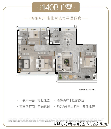 建面约 140㎡ 四房两厅两卫:高端改善入门款,分 A/B 两款户型 ——A 户型高层景观佳,板式布局南北对流,客厅连接观景阳台,享社区园林景观;B 户型为 17F 小高层,7.5 米宽阳台,四开间朝南,北瞰园林南望校园美景;全屋精装交付(含杜拉维特、汉斯格雅等德系一线品牌),主卧配备独立卫浴与观景飘窗,适合年轻高净值家庭,低总价即可享受 “CBD 低密 + 名校”,性价比突出。