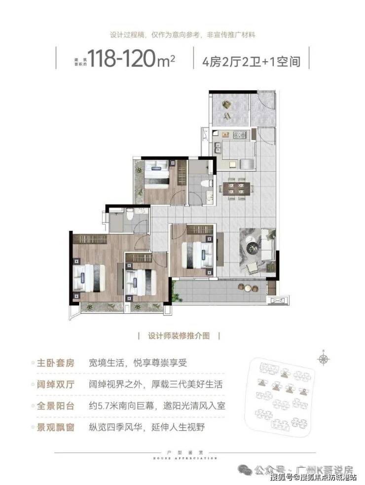 核心亮点: 王牌改善户型。约6.8米阔景横厅,连接大尺度景观阳台,视野开阔。可改造为“4+1”房,灵活多变。双套房或主卧套房+次卧套间设计,保障家庭成员私密性。部分边户户型拥有270°转角视野,俯瞰山景与园林。