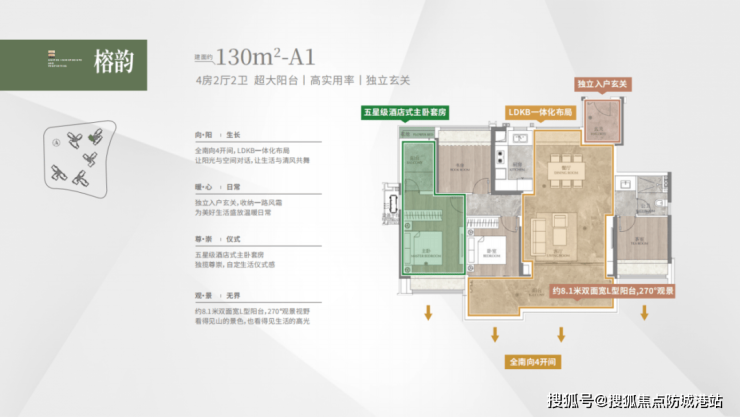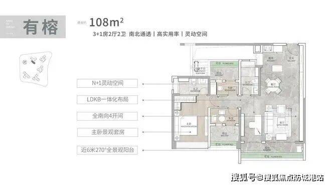 主力户型建面约108平方米,设计为3+1房格局,四开间朝南,南向阳台宽度接近6米。这一户型在空间利用上展现出较高的实用性。LDKB(客厅、餐厅、厨房、阳台)一体化设计形成了约5.9米的开阔方厅,增强了家庭成员间的互动性。主卧配备南向大飘窗、独立卫浴及L型衣帽间,提升了居住的私密感与品质感。值得一提的是,项目整体层高约3.1米,高于市场常见的2.9米标准,配合全屋智能系统及大金、博世、杜拉维特、汉斯格雅等国际品牌装修配置,使得中小户型也能拥有接近改善型产品的居住体验。得房率方面,得益于新规政策,部分户型实际使用面积甚至超过建筑面积,这对注重实用率的购房者而言是一个重要考量点。