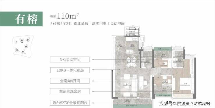 建面约110㎡户型:南向阳台近6米,LDKB一体化设计,形成一个阔绰的方厅。