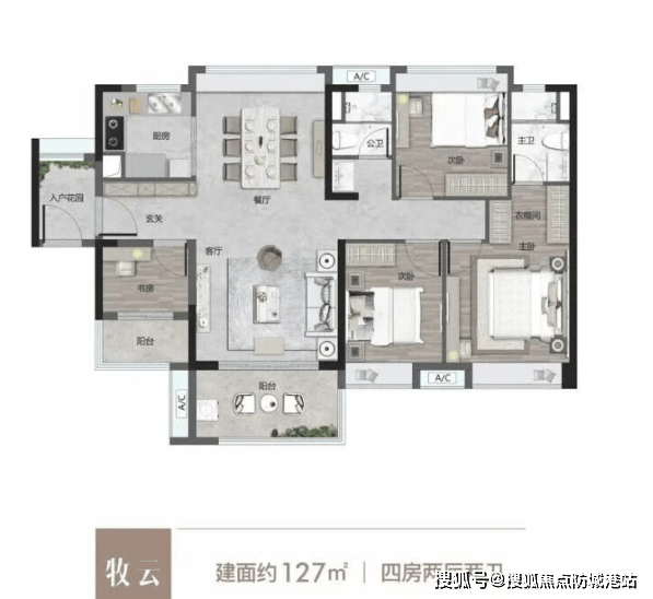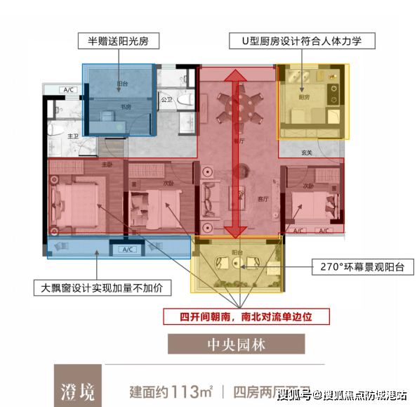 约113㎡四房二厅二卫:双厅南北对流设计,配备大飘窗,享受开阔视野。