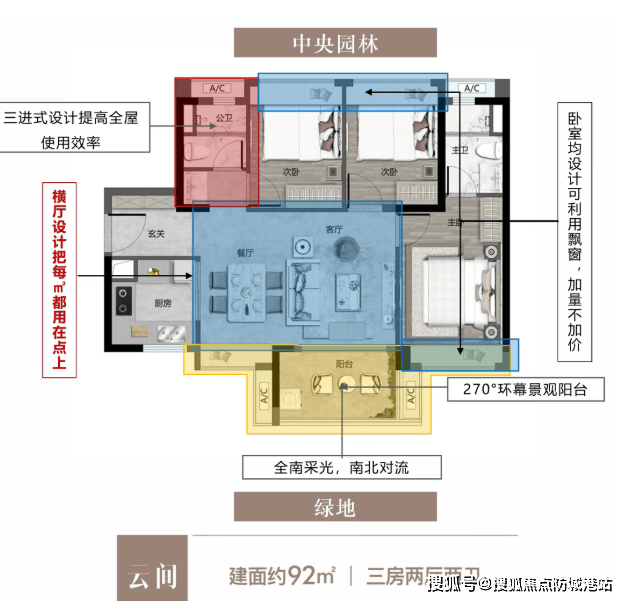 约90㎡三房二厅二卫:全南采光设计,卧室全部配备飘窗,增加居住舒适度。