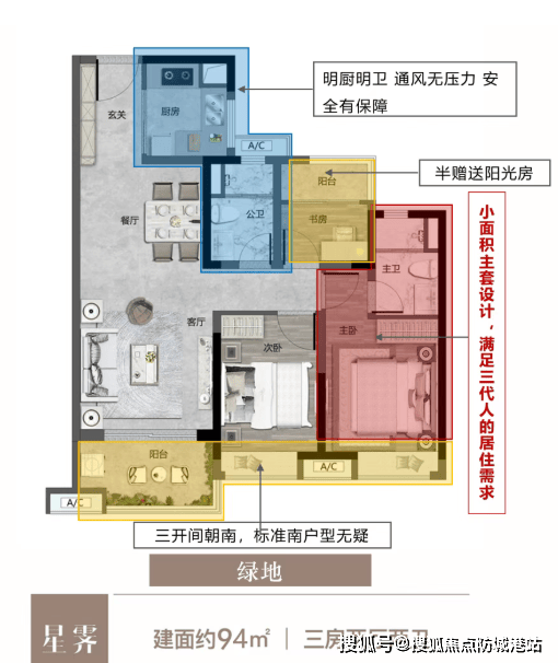 约94㎡三房二厅二卫:南向主套,明亮通风,部分户型赠送阳光房。
