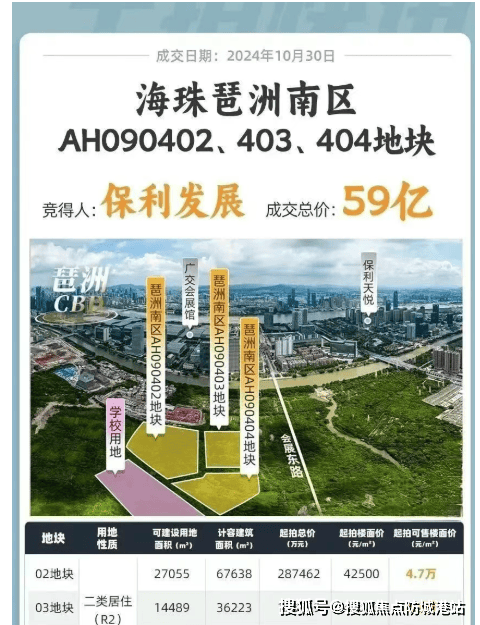 - 2024年10月30日,保利发展以59亿+总价拿下广州琶洲南三兄弟地块,总占地面积约6.66公顷,体量12.8万方,楼面价4.25万 - 4.3万/平(未扣除配建)。尽管地块当时是无路无桥的生地,但因其优越的地理位置与发展潜力,备受保利青睐。地块位于琶洲南TOD项目东侧,与大围公园相邻,北跨黄埔涌便是琶洲中区的广交会展馆,拥有公园、河涌与CBD景观,具备打造高端改善产品的条件。琶洲南区作为琶洲进阶扩容的重要平台,在西区开发趋于饱和、会展区基本开发完毕、东区存在土地权属问题的情况下,成为利好外溢和承接的首站,官方定位为“创新融合拓展区”,聚焦数字创新产业发展及高品质配套,产居比严格控制在2.5 : 1 ,主导商务办公、居住与配套功能,且相关配套正在加速落地。售楼处电话:400 - 828 - 5661