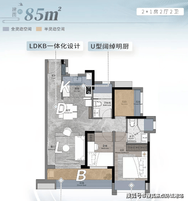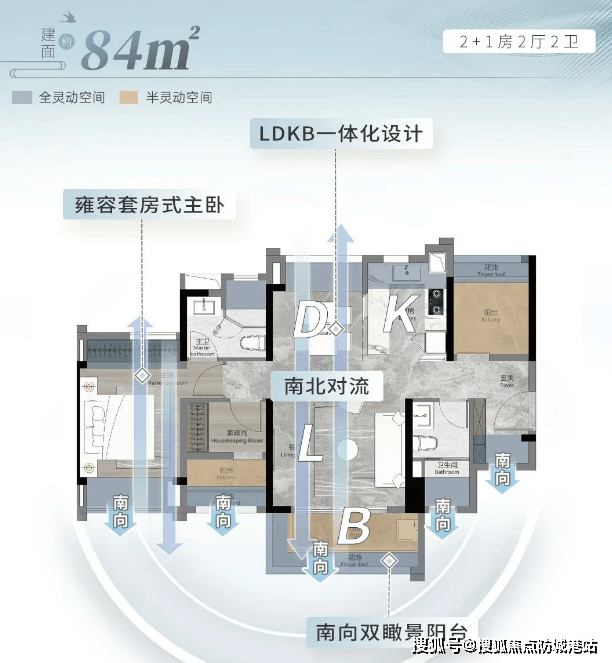 约84㎡三房两厅两卫:南向双瞰景阳台,U型明厨,阔绰套房式主卧,南北对流设计。