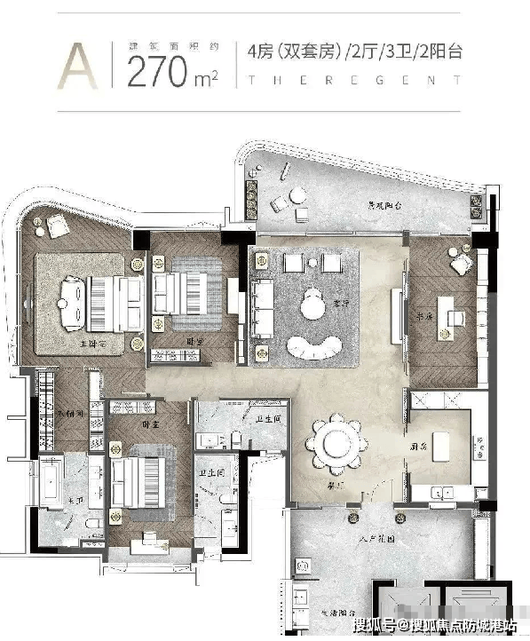 建面约270㎡户型:独立电梯入户,奢享专属归家礼遇。多功能入户花园,定制仪式感空间;双主套房设计,约6米超阔客厅开间,270°环幕江景视野,实现自然与身心的共鸣。