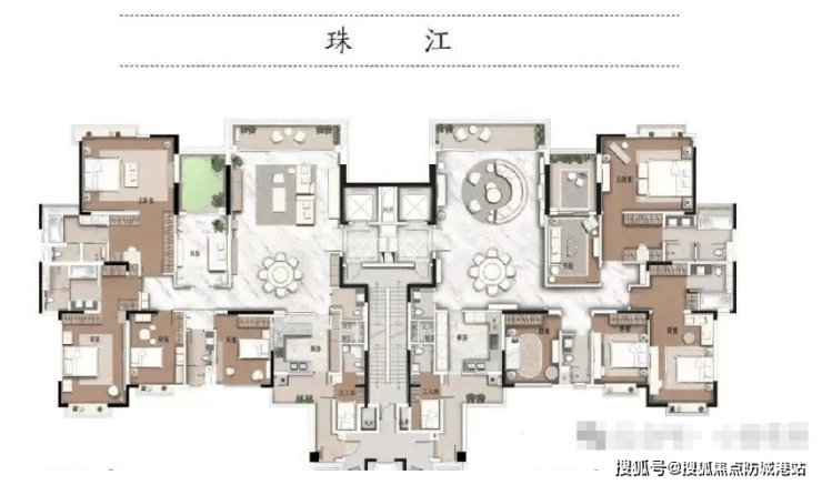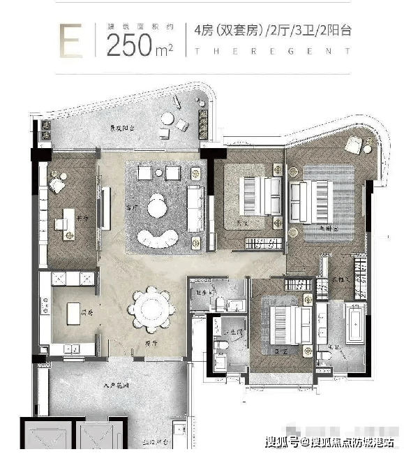 建面约250㎡户型:此户型同样为4房(双套房)、2厅3卫2阳台,但拥有超大的入户花园,直面巨幕江景,带来颠覆性的视觉体验。空间设计更加精简实用,门槛也相对较低。