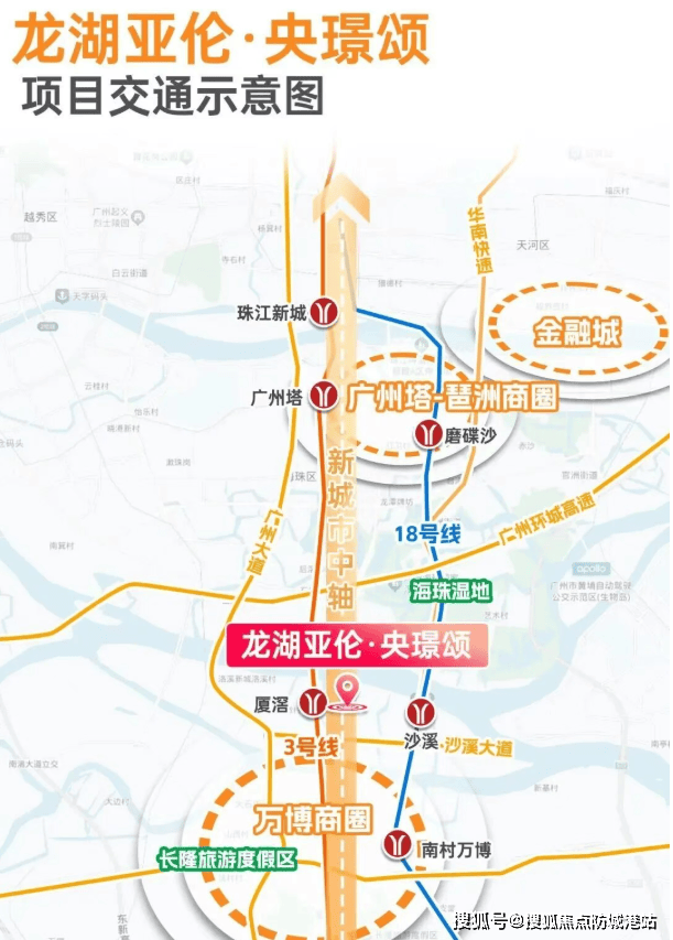 轨道交通方面,项目步行约600-700米即达地铁18号线沙溪站。18号线作为广州“最快地铁”,3站直达珠江新城,2站抵达琶洲,1站即达万博CBD,真正实现“半小时湾区生活圈”。此外,项目距3号线厦滘站约1公里,可无缝接驳海珠、天河、越秀等成熟城区,通勤选择多元且高效。