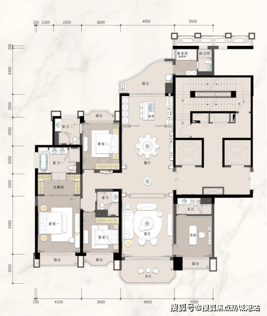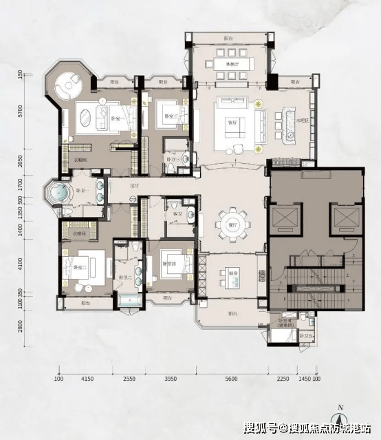 【A2星韵舞步】约264㎡五房两厅五卫,打造优雅艺术领地。户型层高3.47米,采用十字中轴九宫格布局,四开间望奢阔江景,望江面幅面超16米,不仅客厅,三个房间都能享受一线江景,专梯专户设计,尽显归家仪式感。客厅开间约5米,进深约14.6米,面积约73㎡,空间开阔通透,是家庭欢聚与社交宴请的理想场所。