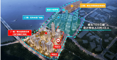 五矿招商江天际由五矿地产、招商蛇口和广州地铁三大开发商携手打造,总占地面积约6.8万平方米,建筑面积约24万平方米,规划户数为1407户,车位比达到1:1.19,容积率为3.6,绿化率为30%。项目共分为三期开发,其中一期的五矿招商江天际包括12栋住宅楼,9栋17-33层住宅,3栋公寓。作为白云槎头站TOD的一部分,项目整体规划了丰富的配套设施,包括幼儿园、少年宫、集中式商业街等,形成一个自成一体的超能生活大城。